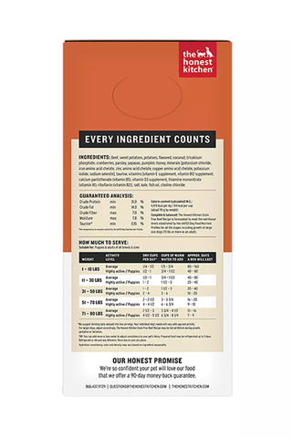 The Honest Kitchen's dehydrated meals must be rehydrated before feeding to your dog. You may use less or more water than suggested, depending on your dog's preference. Split meals into AM and PM.