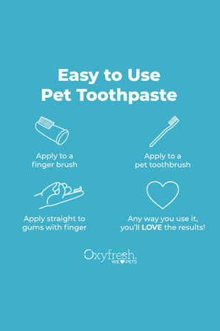 Keep your pet's breath fresh with OxyFresh Pet Dental Kit! This dental kit includes toothpaste, a water additive, and three finger brushes! The toothpaste is made with Oxygene® to actively clean teeth and remove plaque and tarter. The finger brushes are phthalate-free and easy to apply. The water additive can simply be added to your pet's water bowl to keep their teeth clean!