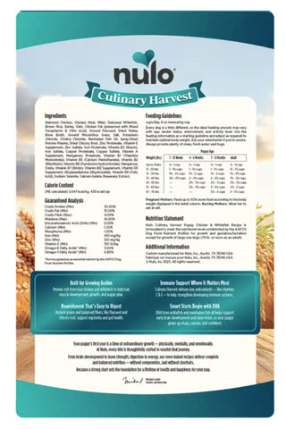 Nulo Culinary Harvest Puppy Chicken and Whitefish Baked Dry Dog Food Highlights: