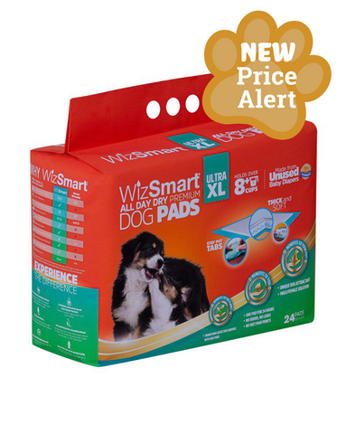 WizSmart Ultra XL Dog Training Pads are ultra-absorbent, odor-trapping, and eco-friendly! These pads feature adhesive Stay Put tabs and hold up to 8 cups of liquid, making them the perfect solution for potty-training, bladder control issues, and marking problems!