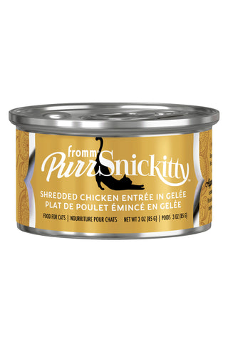 Fromm's PurrSnickitty Shredded Chicken in gelee wet food formula combines the delectable taste of tender shredded chicken suspended in a delicious and flavorful gelee made from a savory chicken and turkey broth. This grain-free formula is an all life-stages appropriate meal for cats.
