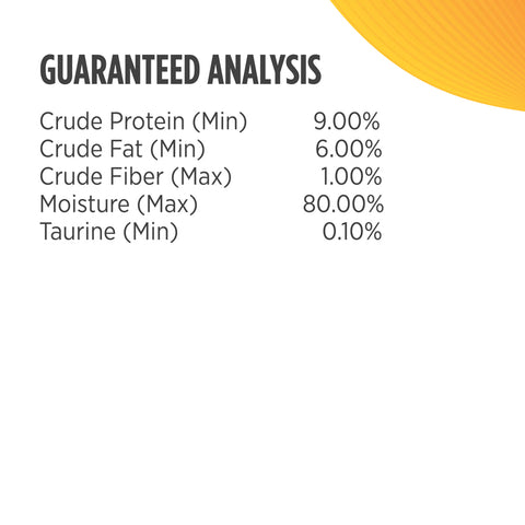 Crude Protein 9.00% (min) Crude Fat 6.00% (min) Crude Fiber 1.00% (max) Moisture 80.00% (max) Taurine 0.10% (min) Ca:P Ratio 1.4:1 Caloric Content 112 kcal/can (2.8 oz)