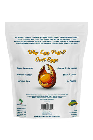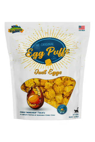 • Wild Meadow Farms Just Egg Puffs Cat Treats are the perfect protein-packed, tasty treat for your feline companion! This single-protein treat is mixed with a variety of your cat's favorite, delicious flavors. These puffs are an excellent choice for cats that have kidney issues or diet sensitivities.