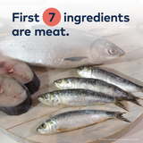 Whole Jack Mackerel (Source of Glucosamine and Chondroitin Sulfate), Hoki, Whole Southern Blue Whiting, Whole Mackerel, Chicken, Chicken Fat, Dried Yellow Peas, Dried Green Lentils, Dried Egg White, Lecithin, Dried Quinoa, Dried Apple Pomace, Natural Flavor, Choline Chloride, Minerals (Dipotassium Phosphate, Magnesium Sulfate, Zinc Amino Acid Complex, Iron Amino Acid Complex, Copper Amino Acid Complex, Manganese Amino Acid Complex), Preservative (Citric Acid, Mixed Tocopherols), Dried Kelp, Taurine, Vitamins (Vitamin E Supplement, Niacin Supplement, Thiamine Mononitrate, Pyridoxine Hydrochloride, Calcium Pantothenate, Folic Acid, Vitamin D3 Supplement), Rosemary Extract.